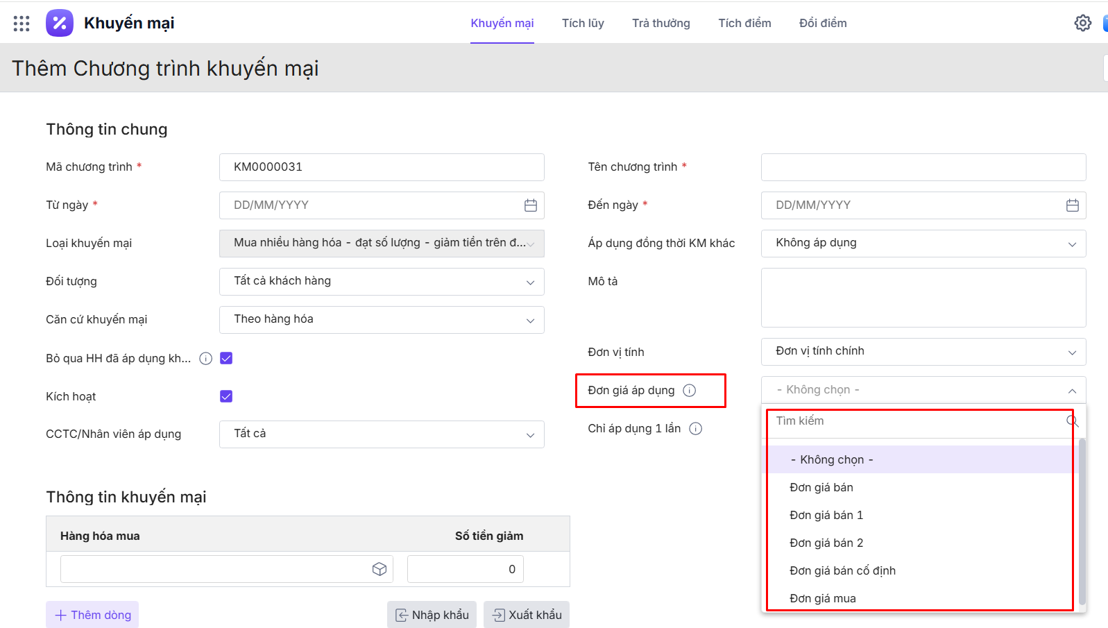 - Loại khuyến mại Mua 1 hàng hóa/Mua nhiều hàng hóa có thêm thông tin Đơn vị tính.