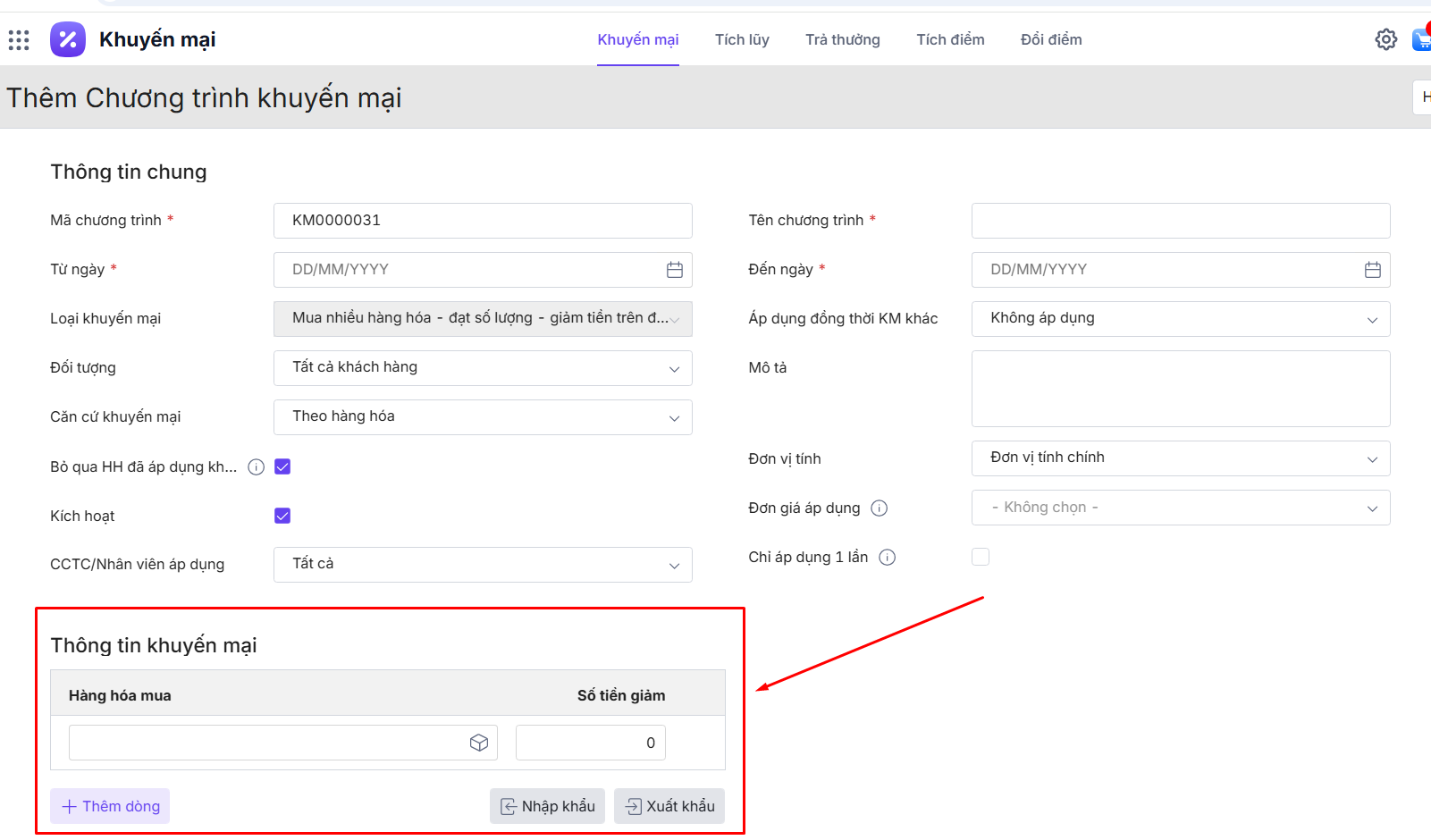- Thêm dòng: Thêm dòng mới trong bảng thông tin khuyến mại.