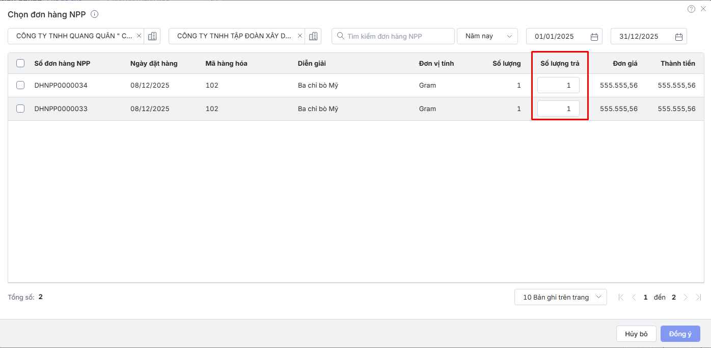 Bước 4: Phần mềm lấy lên hàng hóa mà khách hàng đó đã mua của từng đơn hàng NPP\Tích chọn hàng hóa trả lại và khai báo số lượng trả\Nhấn Đồng ý.