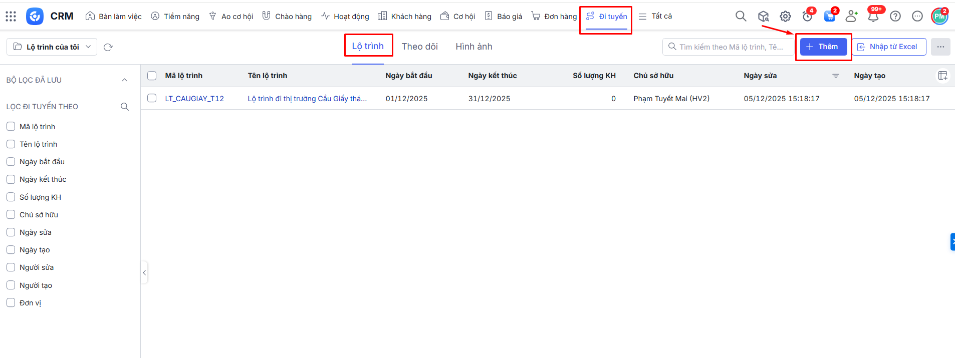 Bước 1: Vào phân hệ Đi tuyến\ ở tab Lộ trình của phân hệ Đi tuyến\ nhấn Thêm.