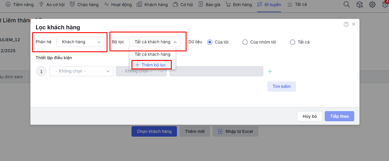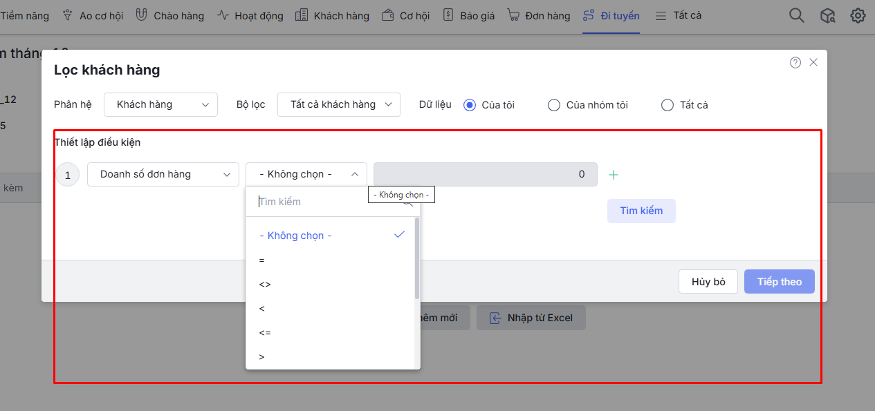 • Chọn khách hàng đã có trên Tiềm năng, Liên hệ, Khách hàng. Người dùng thiết lập bộ lọc khách hàng. Trong đó:
