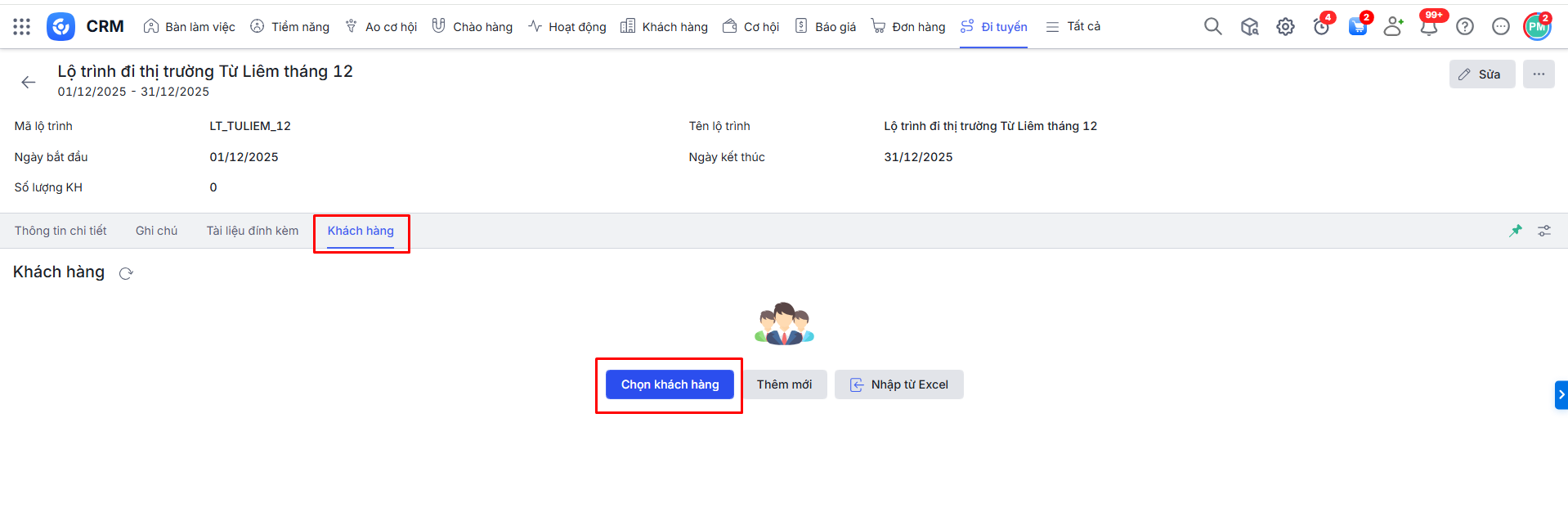 Bước 3: Tại Danh sách liên quan Khách hàng trong chi tiết lộ trình đi tuyến, người dùng tạo danh sách khách hàng để thực hiện lộ trình đi tuyến từ các nguồn: Chọn khách hàng/Thêm mới/ Nhập từ Excel
