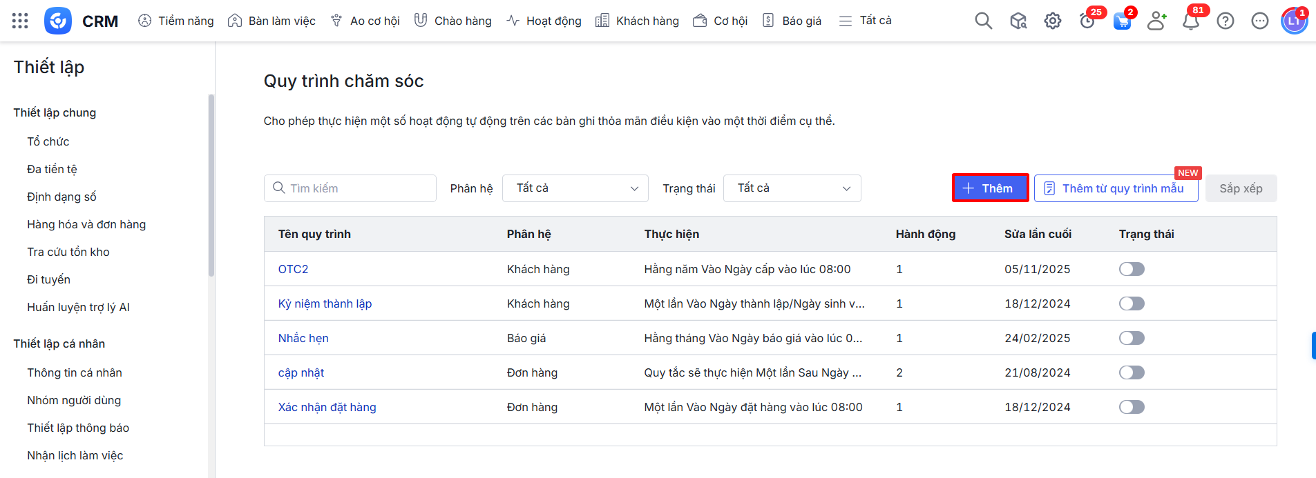 Bài viết hướng dẫn các bước chi tiết để thiết lập một Quy trình chăm sóc khách hàng tự động trên AMIS CRM. Việc xây dựng các quy trình này cho phép hệ thống tự động thực hiện một loạt các hành động (như gửi email, giao nhiệm vụ, cập nhật thông tin…) khi một bản ghi thỏa mãn các điều kiện về thời gian và dữ liệu đã được định sẵn. Điều này giúp chuẩn hóa và tự động hóa các kịch bản chăm sóc khách hàng, đảm bảo không bỏ sót công việc và nâng cao hiệu suất làm việc của đội ngũ.