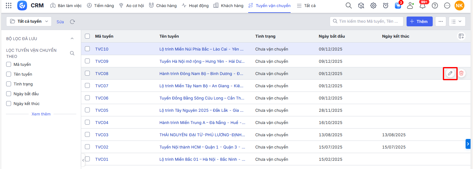 - Chỉnh sửa thông tin Tuyến vận chuyển