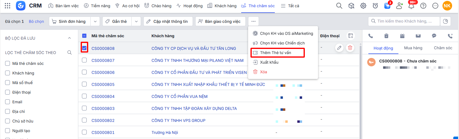 - Các cách tạo Thẻ tư vấn từ Thẻ chăm sóc