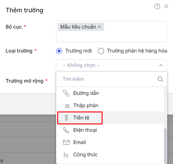 2.1. Thêm trường dạng Tiền tệ trên Bảng thông tin hàng hóa