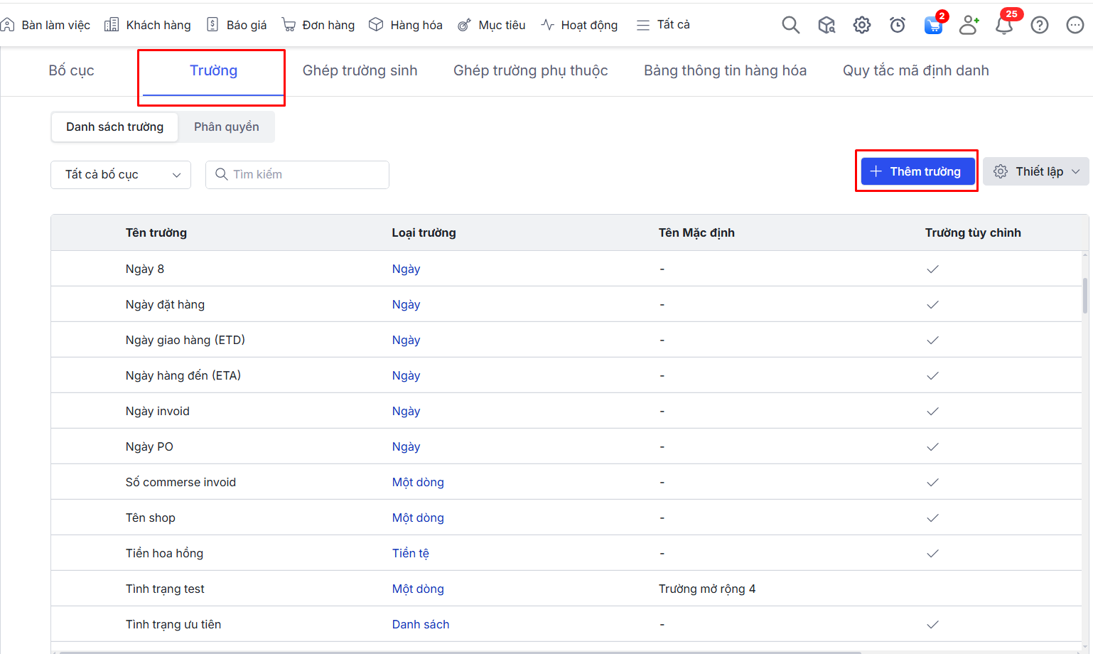 Bước 3: Vào tab Trường\ Nhấn Thêm trường.