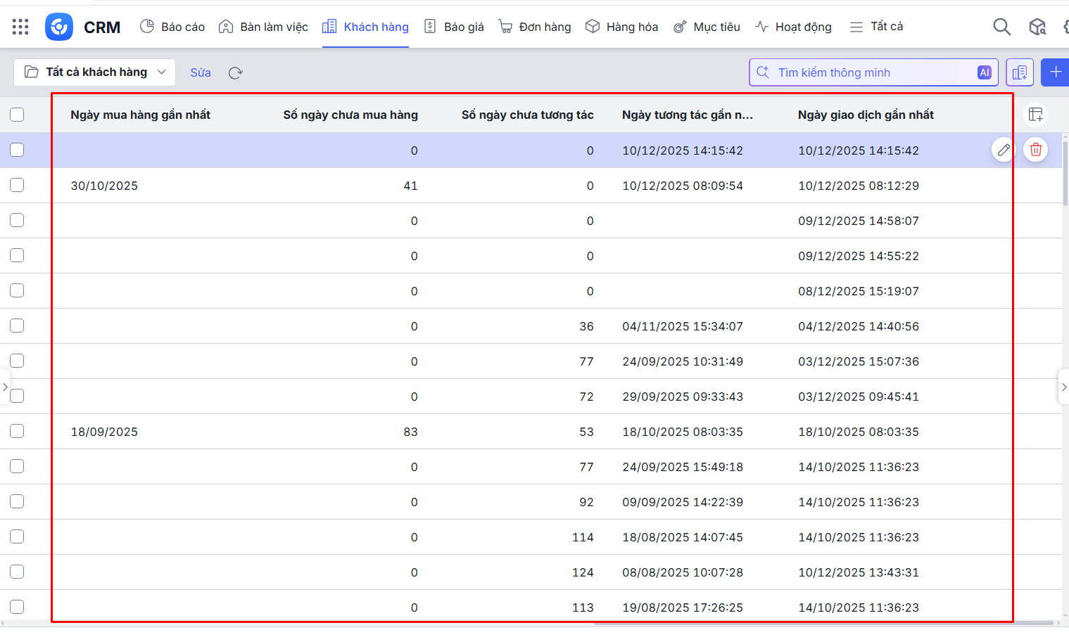 Theo dõi các thông tin Ngày tương tác gần nhất, Số ngày chưa tương tác, Số ngày chưa mua hàng,… của Khách hàng, Tiềm năng, Liên hệ