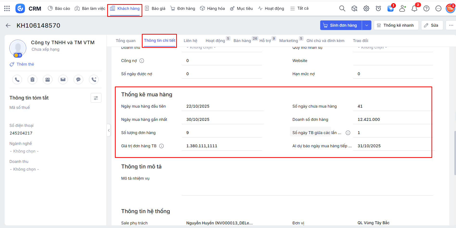 Tại một bản ghi chi tiết Khách hàng\Tại tab Thông tin chi tiết\Mục Thống kê bán hàng bổ sung các trường thông tin: