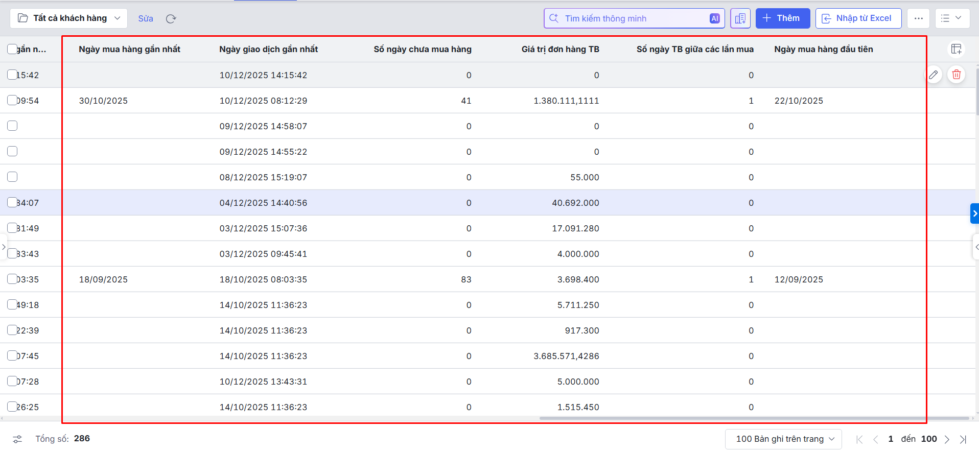 • Thống kê bán hàng theo khách hàng: ngày mua hàng gần nhất, số ngày chưa mua hàng, doanh số, số lượng đơn hàng, giá trị đơn hàng trung bình, số ngày trung bình giữa các lần mua.
