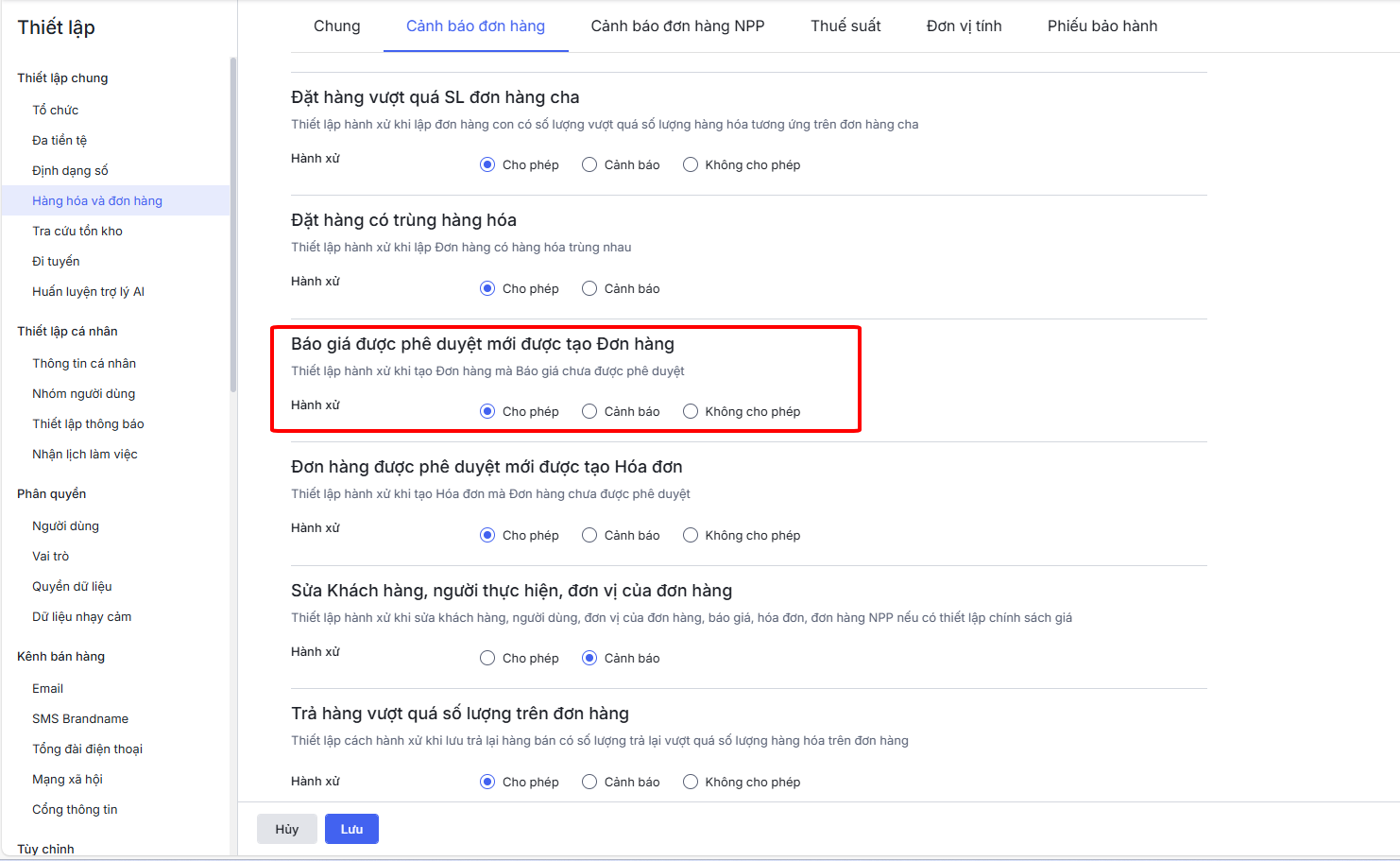 • Thiết lập “Bắt buộc Báo giá được phê duyệt mới được tạo Đơn hàng”