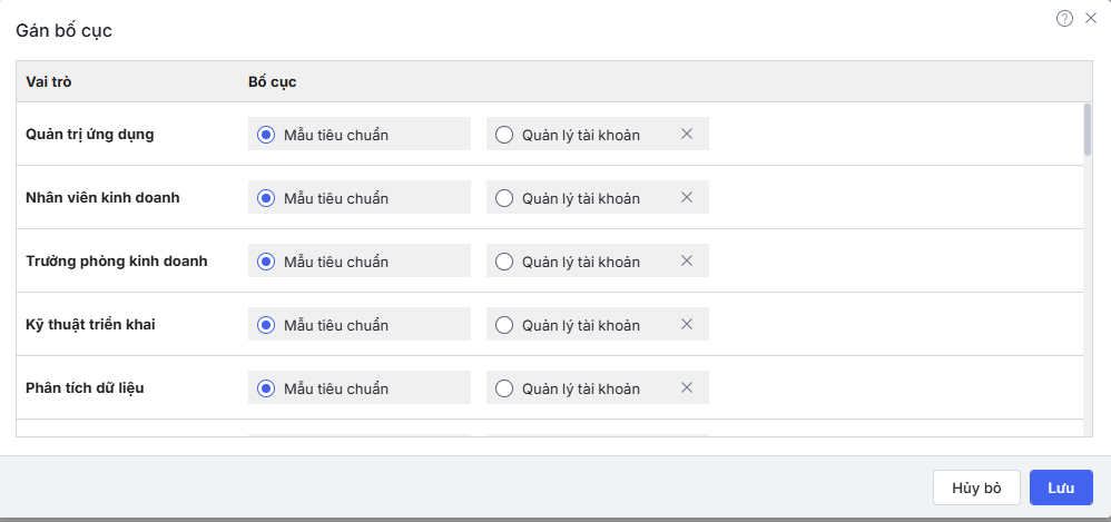 Bước 2: Chọn bố cục được gán cho từng vai trò. Trong trường hợp cần gán bố cục cho riêng người sử dụng thì cần tạo mới riêng các vai trò (thêm vai trò/nhân bản vai trò) và phân quyền cho chỉ người dùng đó thuộc vai trò đó để gán.