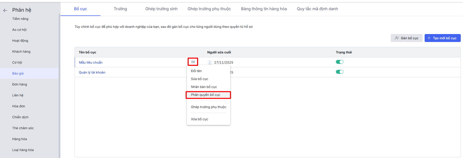 Bước 1: Di chuột đến dòng chứa bố cục muốn sửa, nhấn vào biểu tượng ba chấm ⋯\chọn Phân quyền bố cục