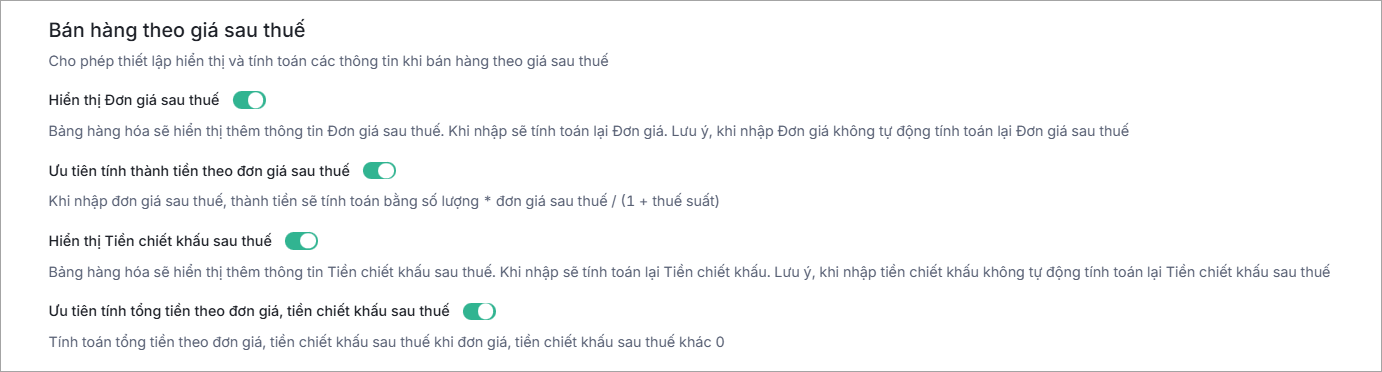 ∎ Thiết lập Ưu tiên tính thành tiền theo đơn giá sau thuế: Lựa chọn Bật thiết lập để hệ thống tính giá trị Thành tiền theo Đơn giá sau thuế.