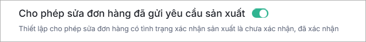 Khi bật lựa chọn này, hệ thống cho phép chỉnh sửa với Đơn hàng có tình trạng xác nhận sản xuất là Chưa xác nhận/Đã xác nhận.