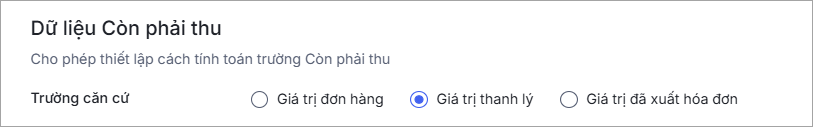 Bước 2: Tại mục Dữ liệu Còn phải thu, chọn cách lấy dữ liệu cho trường thông tin Còn phải thu của đơn hàng theo nhu cầu.