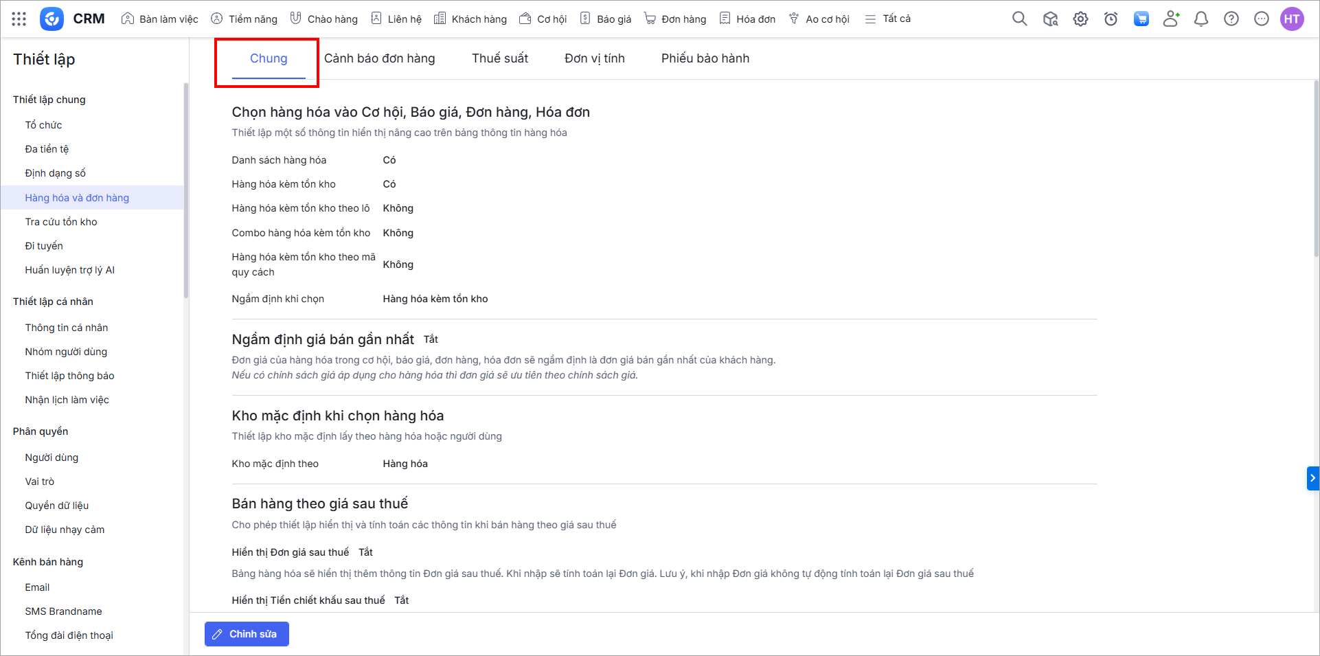 ∎ Thiết lập Hiển thị đơn giá sau thuế: Lựa chọn Bật thiết lập để hiển thị cột thông tin Đơn giá sau thuế trên bảng hàng hóa của Đơn hàng, Báo giá, Hóa đơn, Cơ hội.