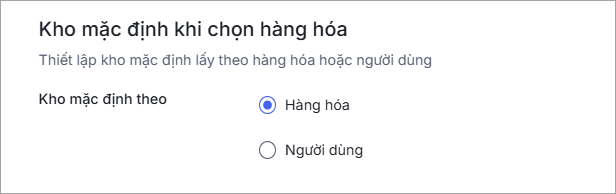 Bước 2: Ở mục Kho mặc định khi chọn hàng hóa, lựa chọn kho mặc định theo Hàng hóa hoặc Người dùng: