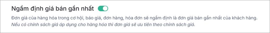 Khi tạo Đơn hàng, Hóa đơn, Báo giá, Cơ hội, đơn giá của hàng hóa sẽ tự động ngầm định là đơn giá bán gần nhất của khách hàng.
