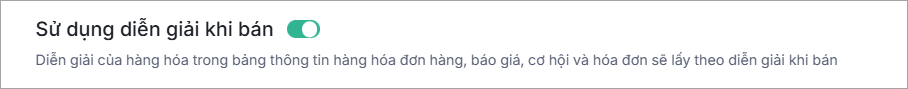 Khi Bật lựa chọn này, tại bảng thông tin hàng hóa của Đơn hàng, Báo giá, Cơ hội, Hóa đơn, khi chọn hàng hóa sẽ lấy thông tin Diễn giải khi bán vào trường Diễn giải của dòng hàng hóa.