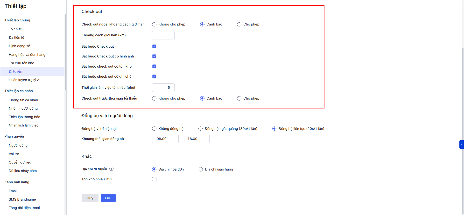 – Bắt buộc Check out có tồn kho: Khi tích chọn thiết lập này, hệ thống sẽ không cho phép NVKD thực hiện check out tại địa chỉ khách hàng nếu trong hoạt động đi tuyến không có thông tin tồn kho hàng hóa.