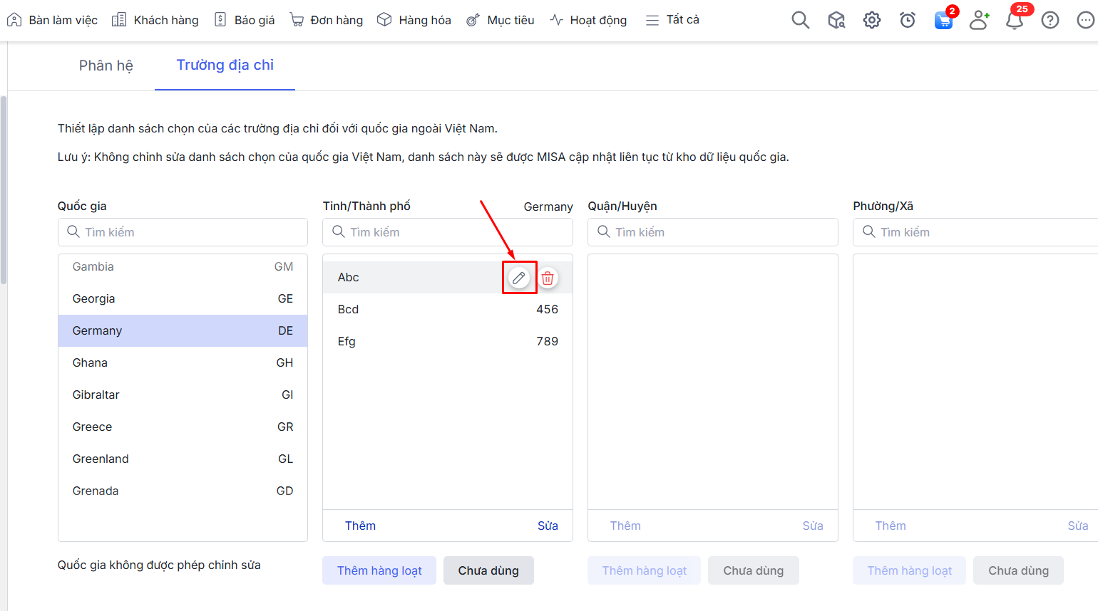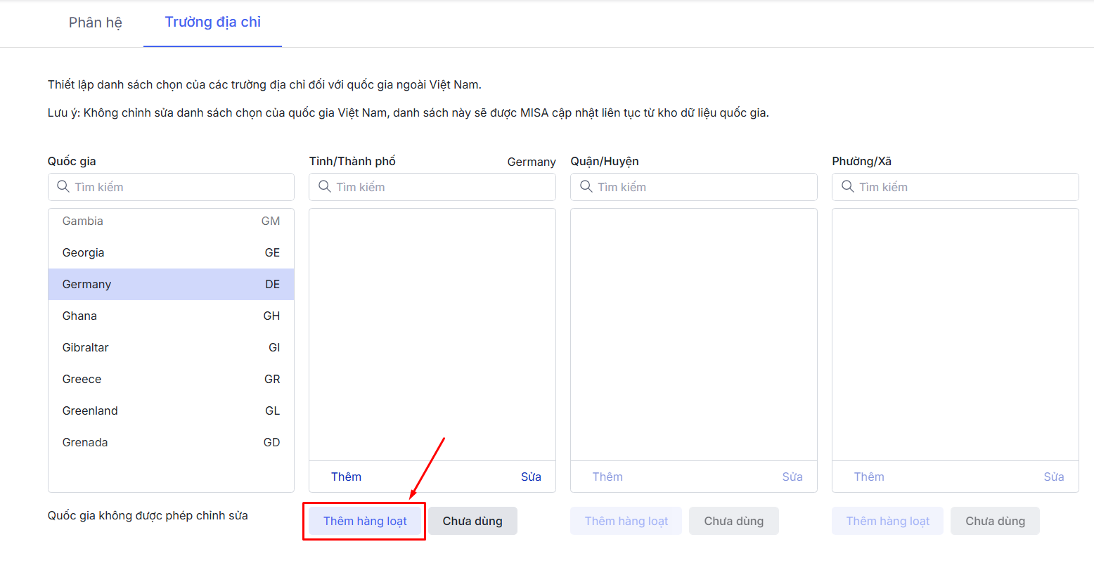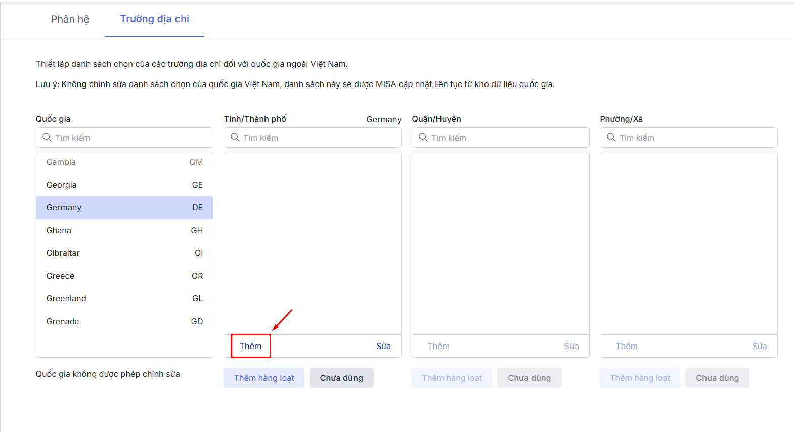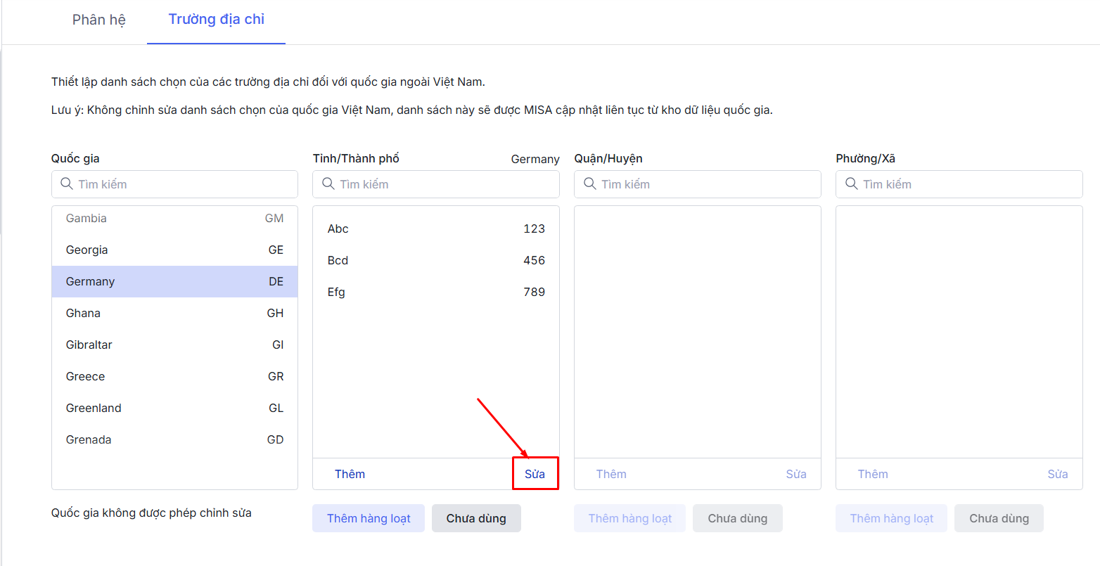 Bước 2: Vào tab Trường địa chỉ\Ở cột Quốc gia\ Nhấn chọn Quốc gia muốn sửa thông tin Tỉnh/Thành phố.