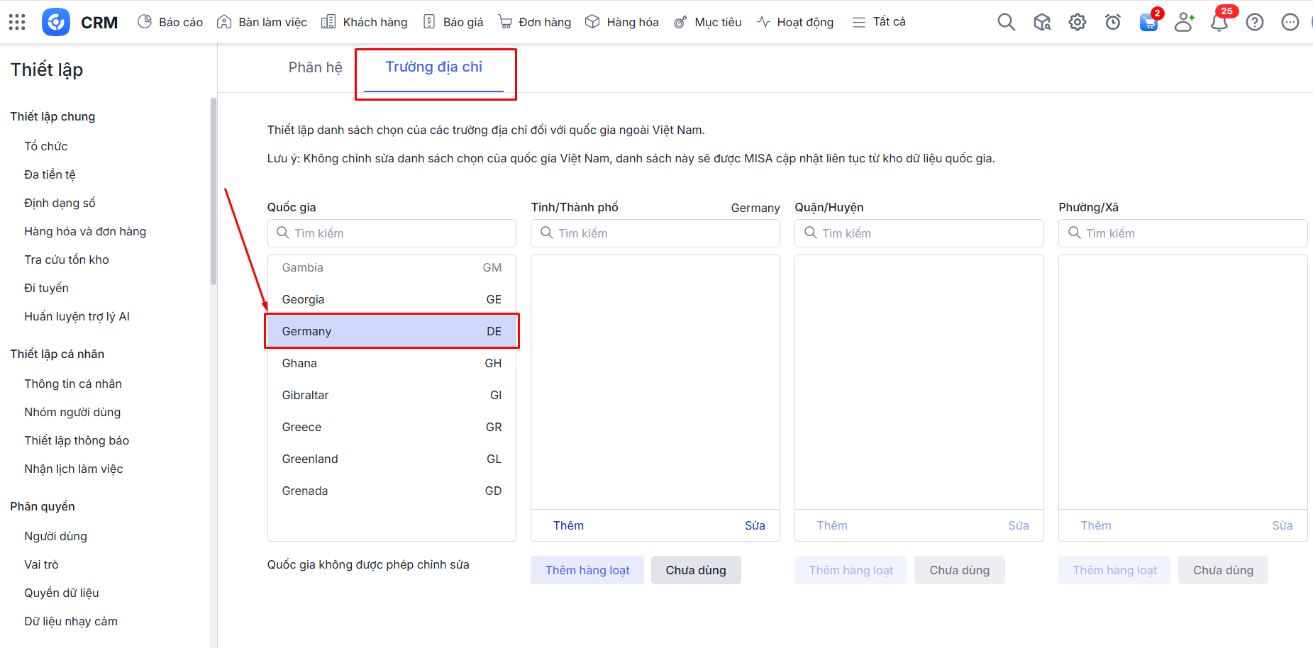 Bước 2: Vào tab Trường địa chỉ\Ở cột Quốc gia\ Nhấn chọn Quốc gia muốn thiết lập thông tin Tỉnh/Thành phố.