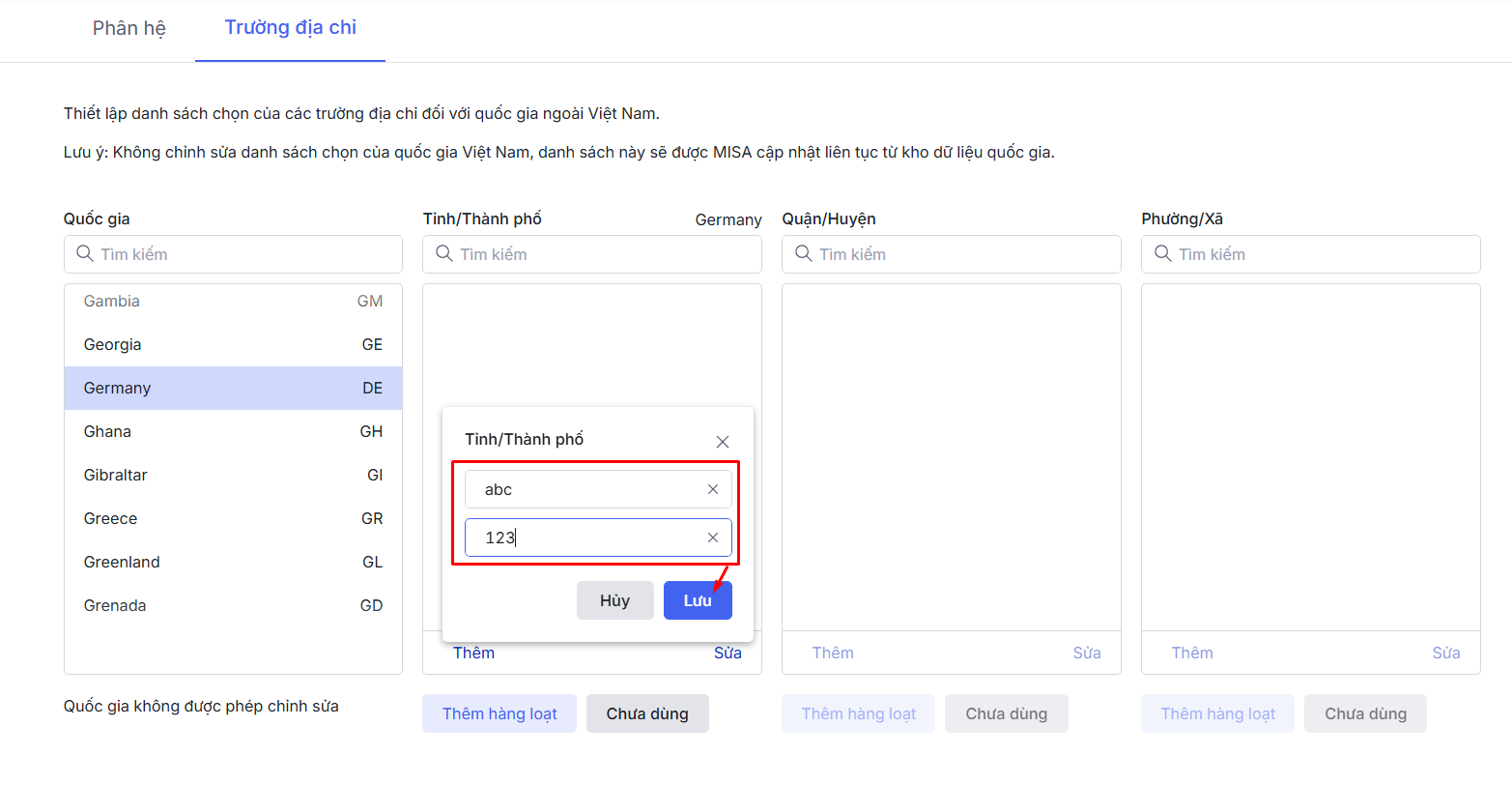 - Lưu ý: Thiết lập này chỉ áp dụng khi thêm mới thông tin địa chỉ nước ngoài, còn đối với thông tin địa chỉ trong nước (Việt Nam) sẽ không sửa hay thêm mới được.