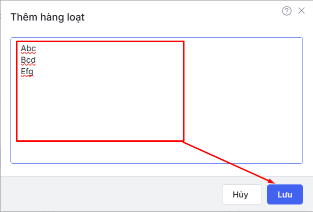 để thêm 1 dòng\ Nhấn Thêm hàng loạt để nhập hàng loạt\ Nhấn biểu tượng dấu trừ