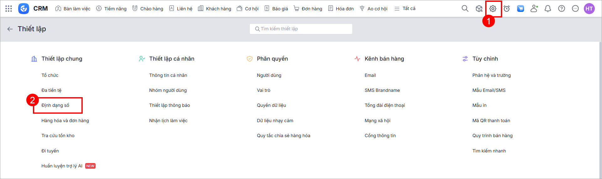 Bước 1: Trên AMIS CRM, nhấn vào biểu tượng để hiển thị Thiết lập. Vào Thiết lập chung\Định dạng số.