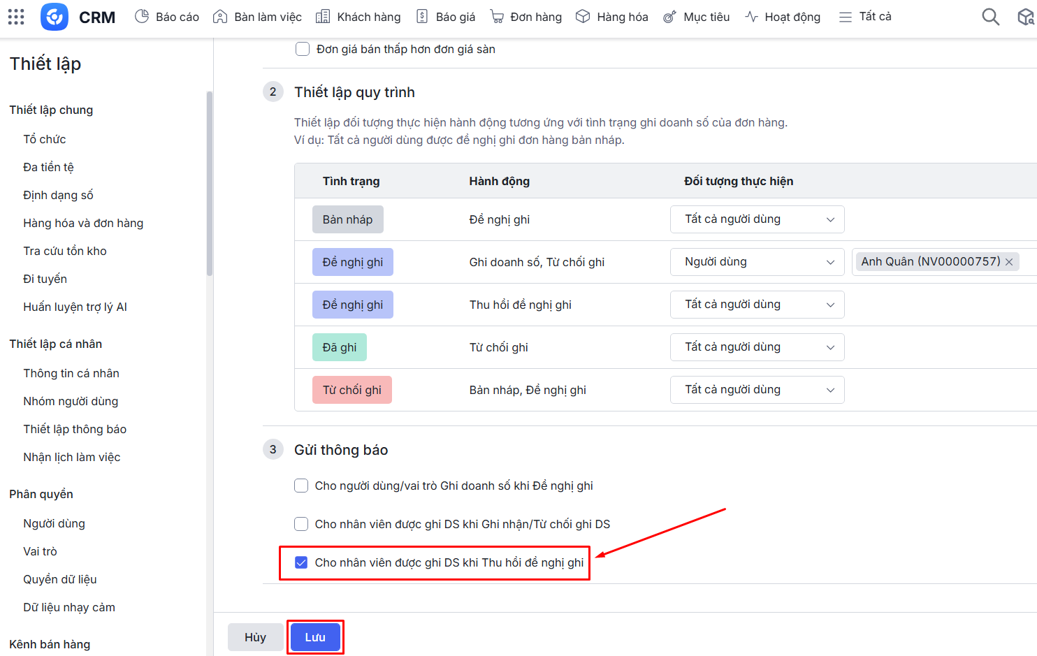 - Nếu tích chọn thiết lập này thì khi thu hồi đề nghị ghi thành công đối với các đơn hàng thỏa mãn điều kiện ghi doanh số\ Hệ thống thông báo ở quả chuông cho nhân viên được ghi doanh số (trừ trường hợp người thao tác thu hồi là nhân viên được ghi doanh số).