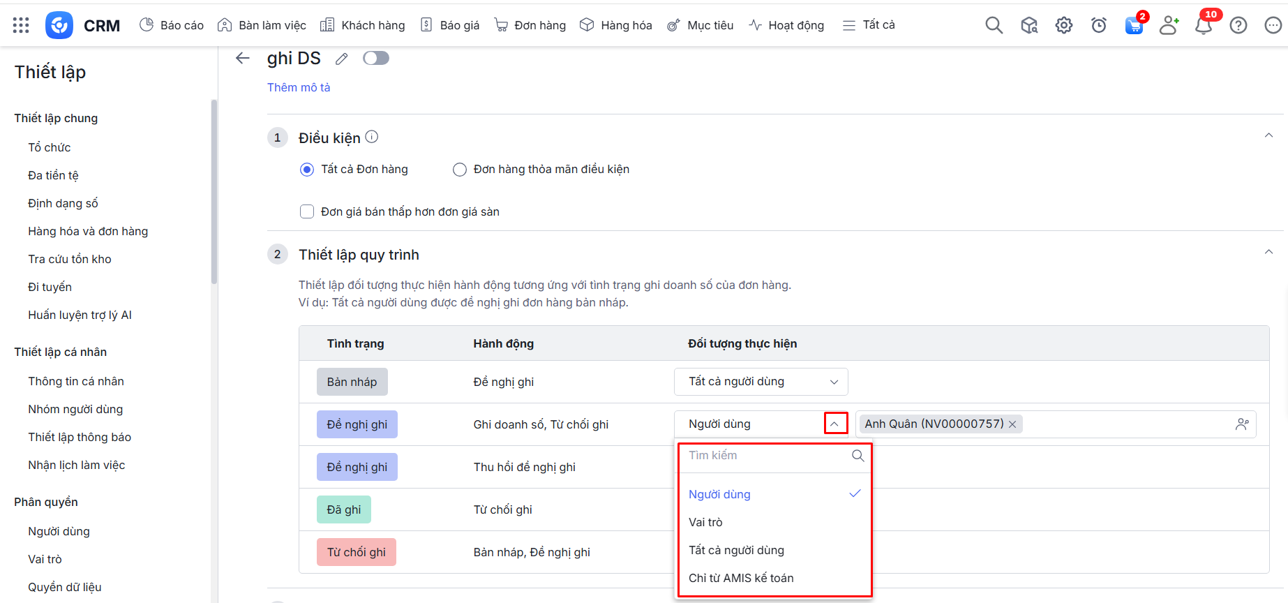 - Người dùng: Chọn những người dùng đích danh được quyền thực hiện Thu hồi đề nghị ghi doanh số cho đơn hàng có tình trạng Đề nghị ghi.