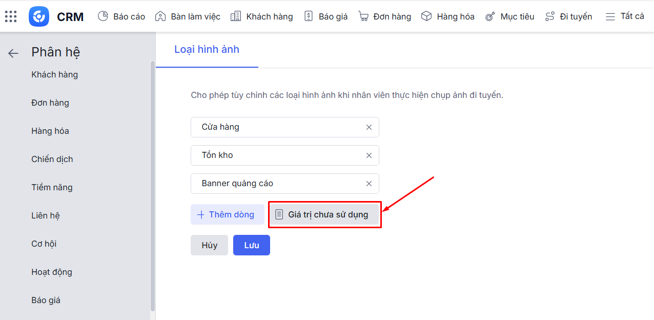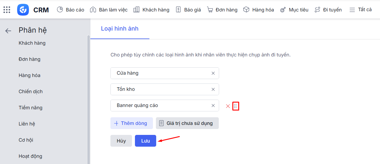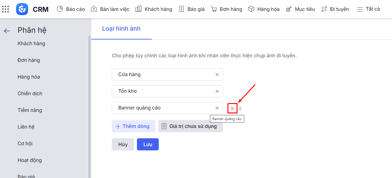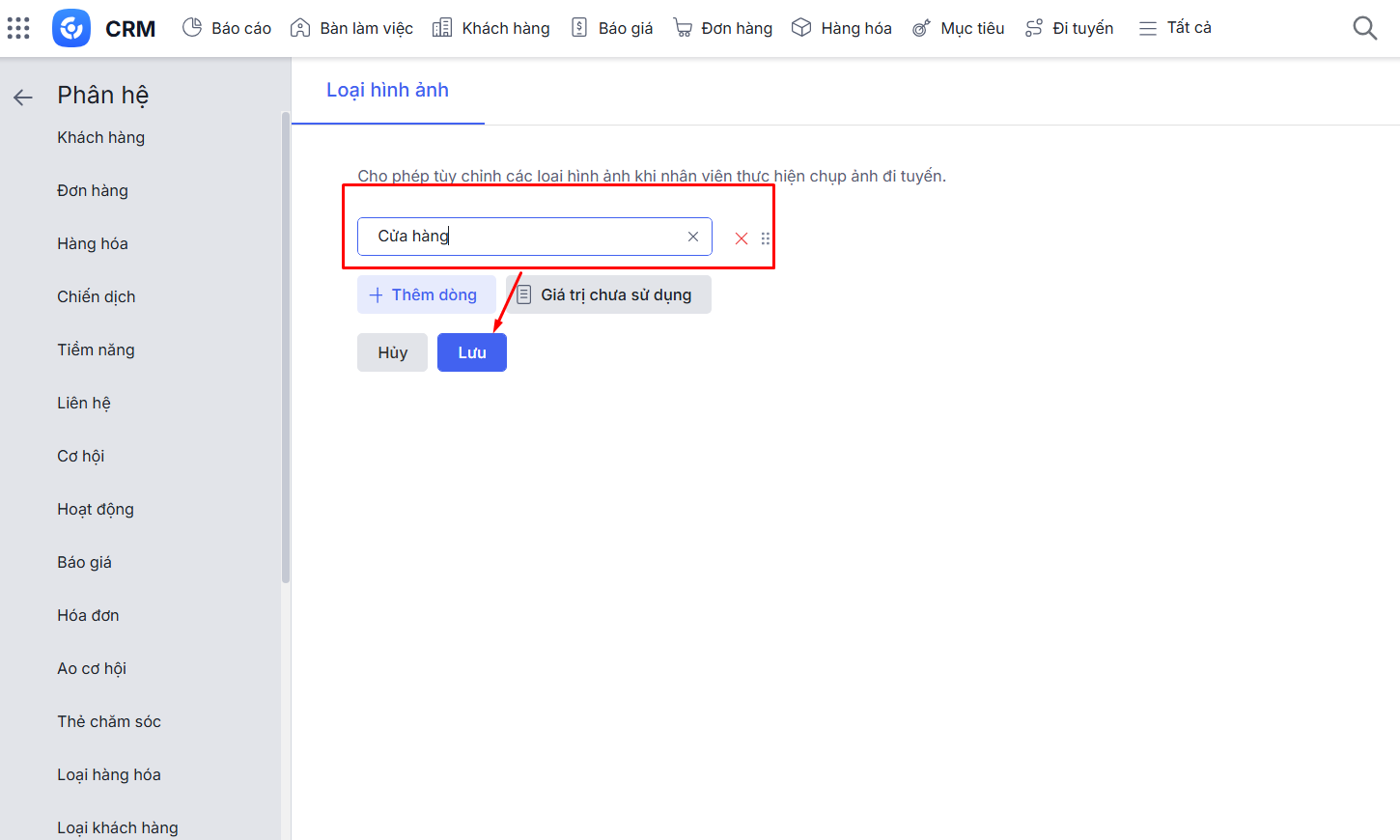 - Truy cập thiết lập Loại hình ảnh trong phân hệ Đi tuyến.