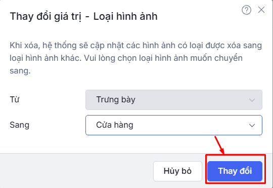 Đối với thao tác xóa: Sau khi chọn Đồng ý\ Chọn Loại hình ảnh để hệ thống sẽ thực hiện cập nhật các hình ảnh thuộc loại hình ảnh vừa bị xóa sang loại hình ảnh được chọn\ Nhấn Thay đổi để hoàn thành.
