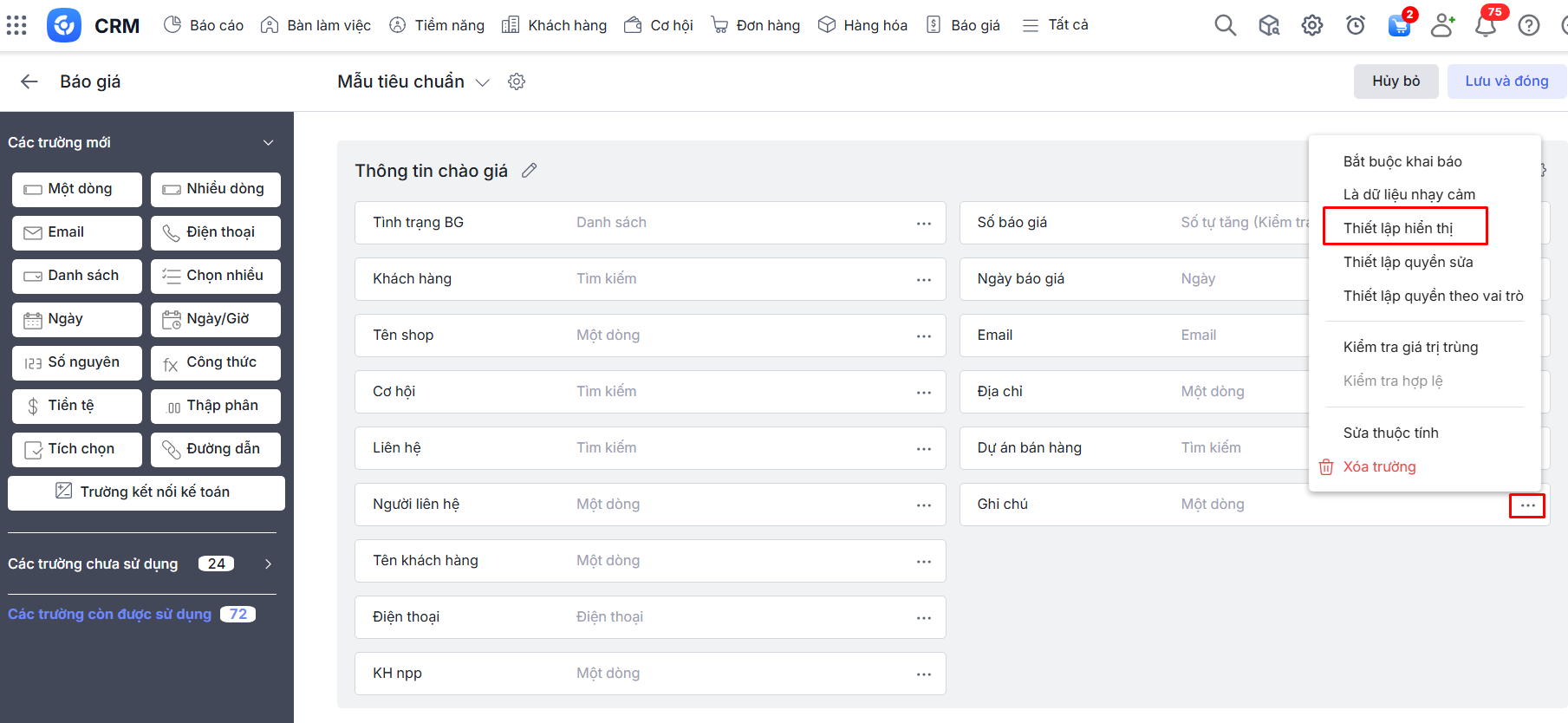 Bước 2: Quay trở lại giao diện Thiết lập phân hệ và trường của các phân hệ\ Di chuột đến dòng phân hệ Cơ hội/Liên hệ/Khách hàng/Báo giá/Đơn hàng/Thẻ chăm sóc\ Nhấn vào biểu tượng dấu ba chấm