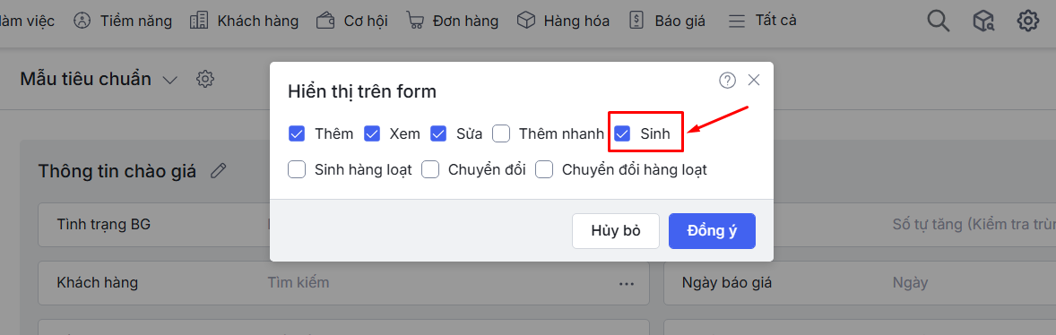 Ví dụ: Nếu muốn khi sinh Đơn hàng từ Báo giá sẽ tự động lấy lên thông tin trường Ghi chú ở Báo giá sang một trường bên Đơn hàng mà không cần tự nhập tay lại. Thì trên bố cục Báo giá và Đơn hàng trường Ghi chú đều cần được tích chọn Sinh.