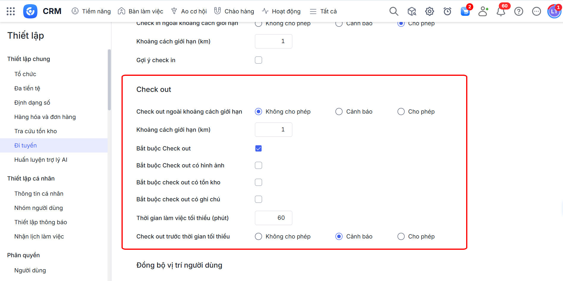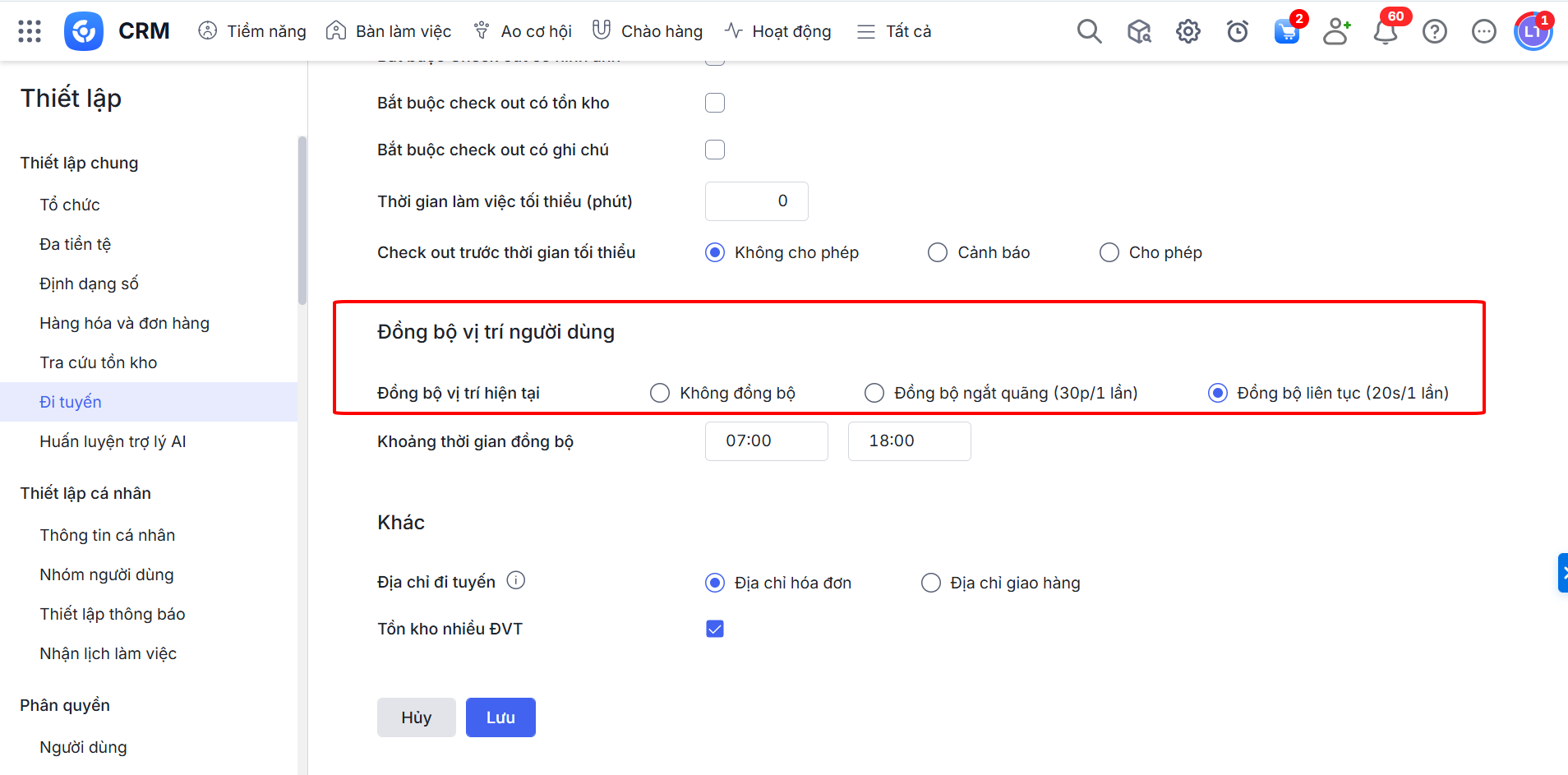 Ở mục Đồng bộ vị trí người dùng, chọn tần suất hệ thống đồng bộ vị trí hiện tại của nhân viên khi đi tuyến từ ứng dụng AMIS CRM mobile (yêu cầu cho phép ứng dụng AMIS CRM mobile chạy nền và truy cập vị trí trên điện thoại) lên AMIS CRM Web để quản lý theo dõi.