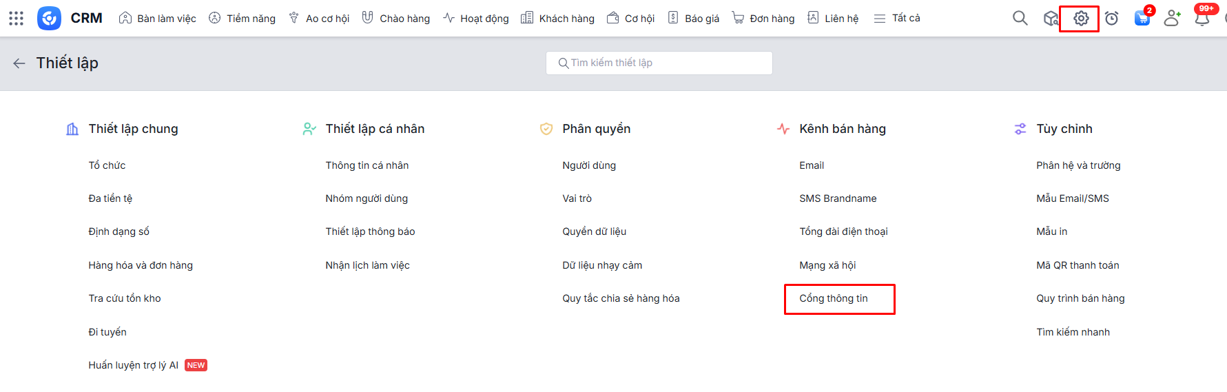 Bước 1: Nhấn vào biểu tượng bánh răng \Kênh bán hàng\Cổng thông tin.