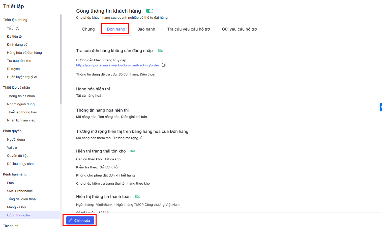 Thiết lập thông tin đơn hàng trên Cổng thông tin