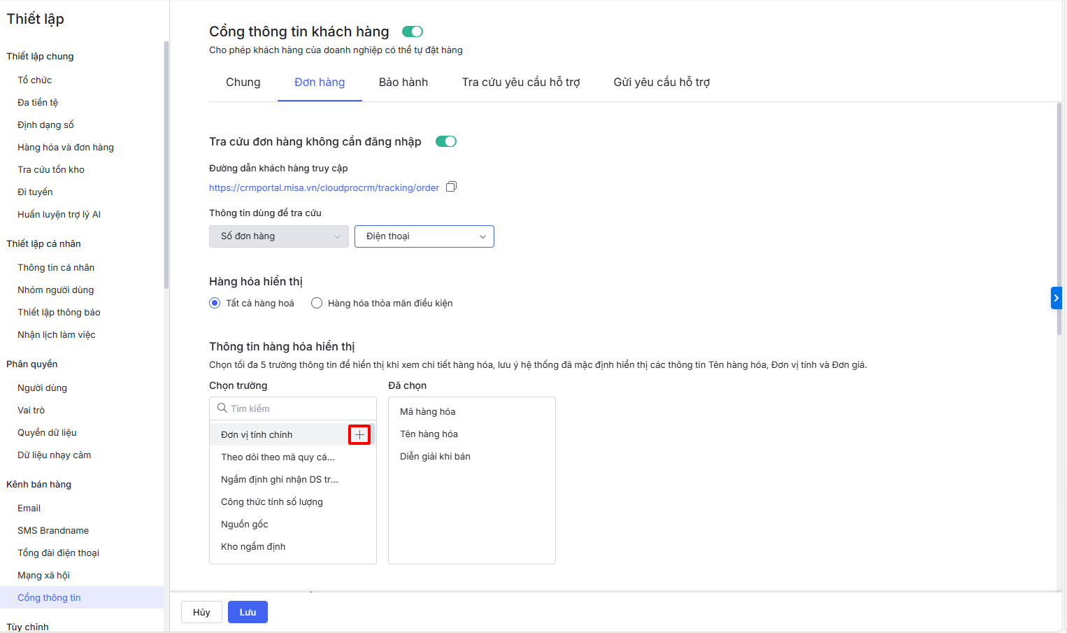 Bài viết hướng dẫn các thiết lập Đơn hàng trên Cổng thông tin AMIS CRM, hỗ trợ doanh nghiệp kiểm soát hiển thị hàng hóa, trạng thái tồn kho, phương thức thanh toán và quy tắc tiếp nhận đơn hàng. Việc thiết lập đúng giúp tối ưu trải nghiệm đặt hàng của khách hàng và đảm bảo quy trình xử lý đơn hàng hiệu quả.