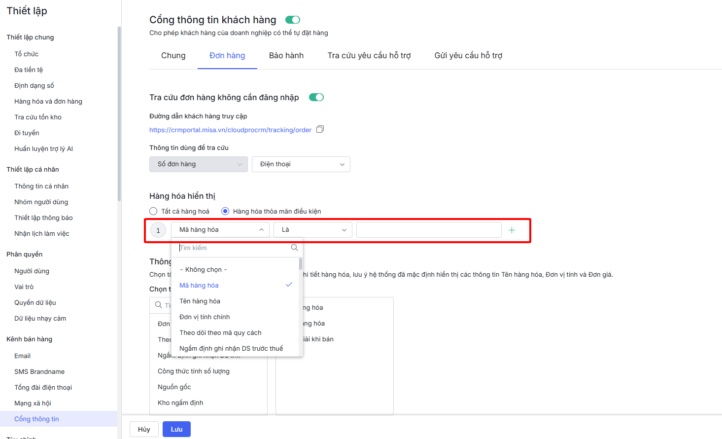 • Cấu hình danh sách hàng hóa hiển thị (toàn bộ hoặc theo điều kiện)