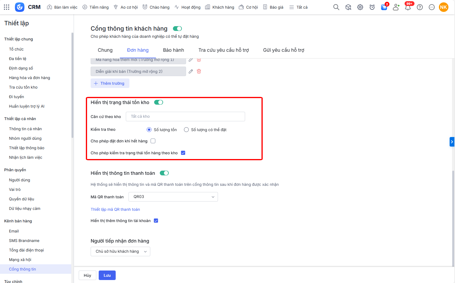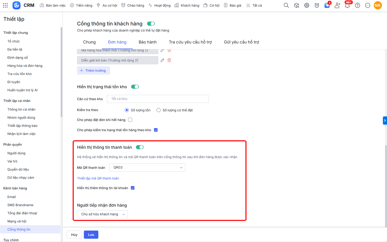 Bước 1: Bật lựa chọn để thiết lập hiển thị mã QR thanh toán trên Đơn hàng đặt từ Cổng thông tin.