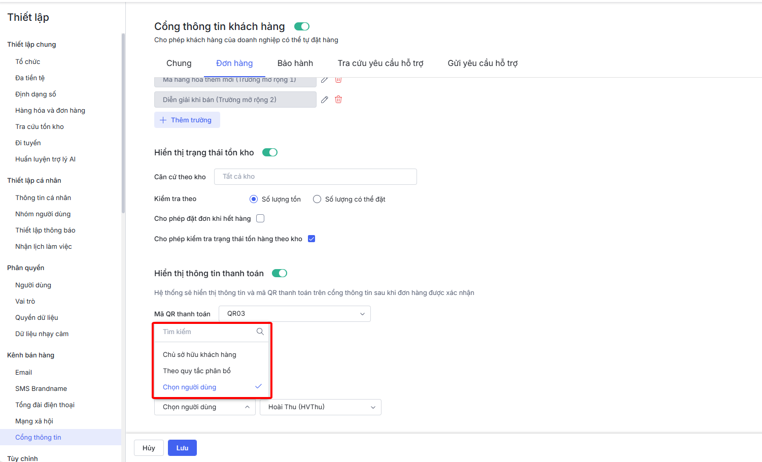 • Thiết lập người tiếp nhận đơn hàng: theo quy tắc phân bổ hoặc người dùng cụ thể