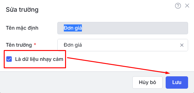 để sửa trường có sẵn hoặc Nhấn thêm trường\ Tích chọn Là dữ liệu nhạy cảm.
