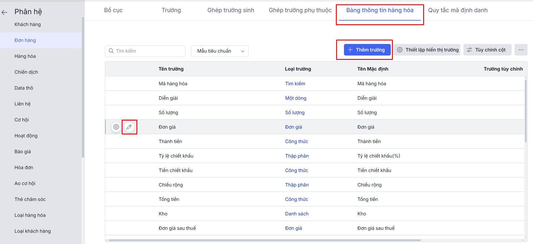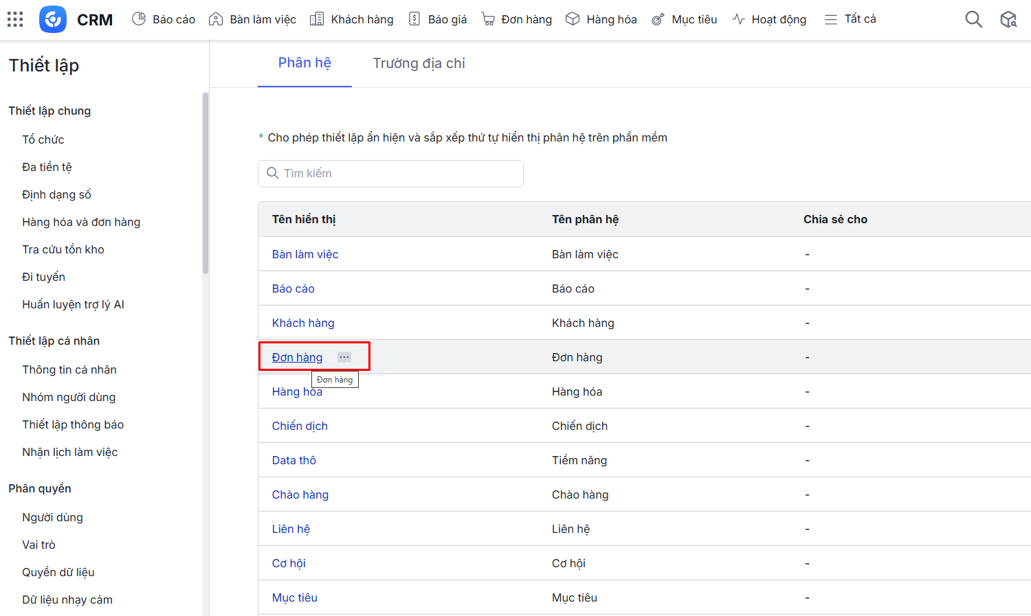 Bước 2: Vào phân hệ muốn thiết lập (Các phân hệ có bảng thông tin hàng hóa: Cơ hội, Báo giá, Đơn hàng, Đơn hàng NPP, Trả lại hàng bán, Trả hàng NPP, Yêu cầu mua hàng, Hóa đơn.).