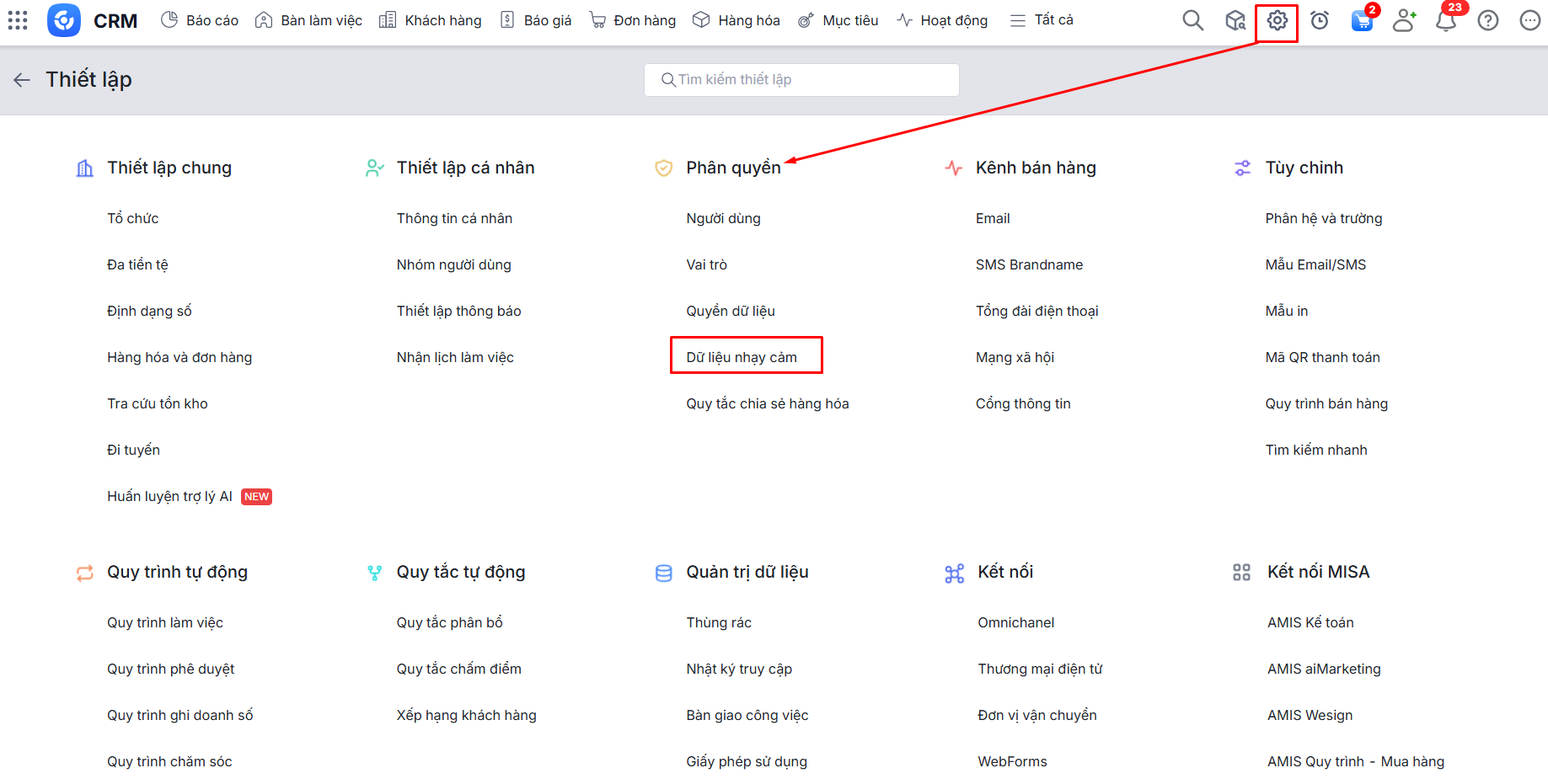để vào Thiết lập\ Vào Phân quyền\ Dữ liệu nhạy cảm.
