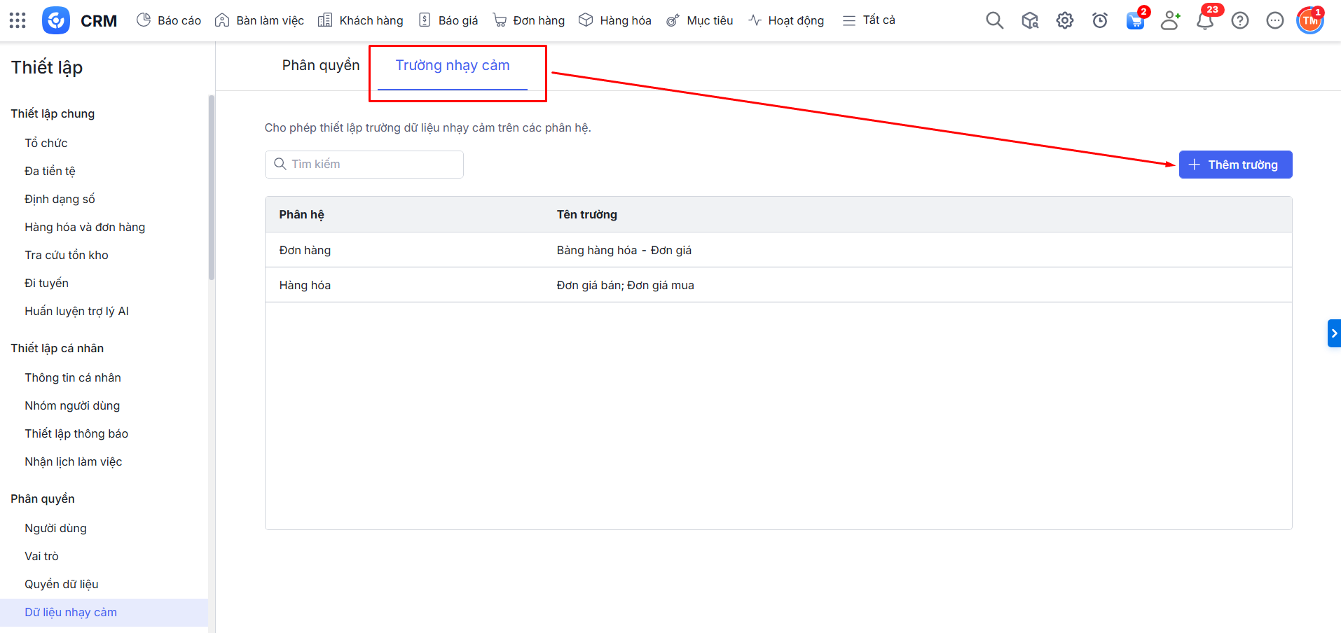 - Cách thiết lập trường nhạy cảm tại Phân quyền Dữ liệu nhạy cảm.