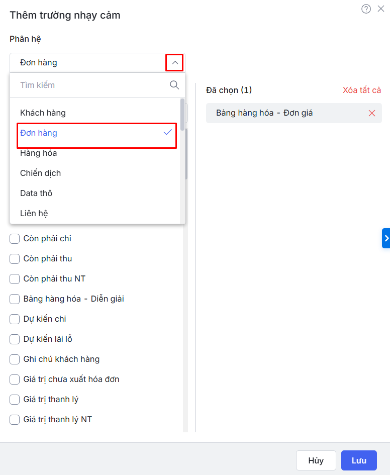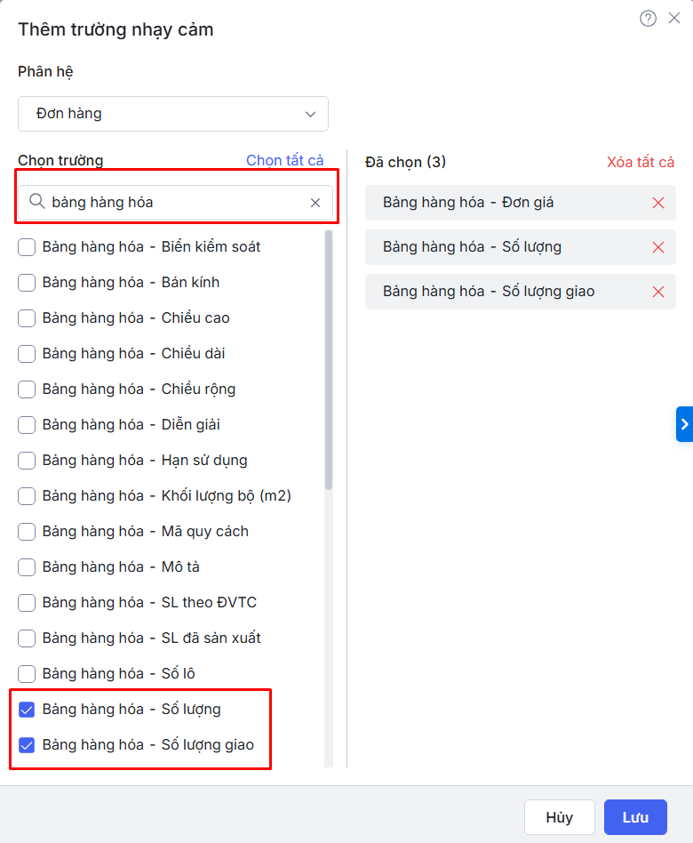 Bước 4: Ở mục Chọn trường\ Tìm kiếm các trường có Bảng hàng hóa bắt đầu để phân biệt\ Tích chọn vào các trường trên bảng hàng hóa muốn thiết lập là dữ liệu nhạy cảm.