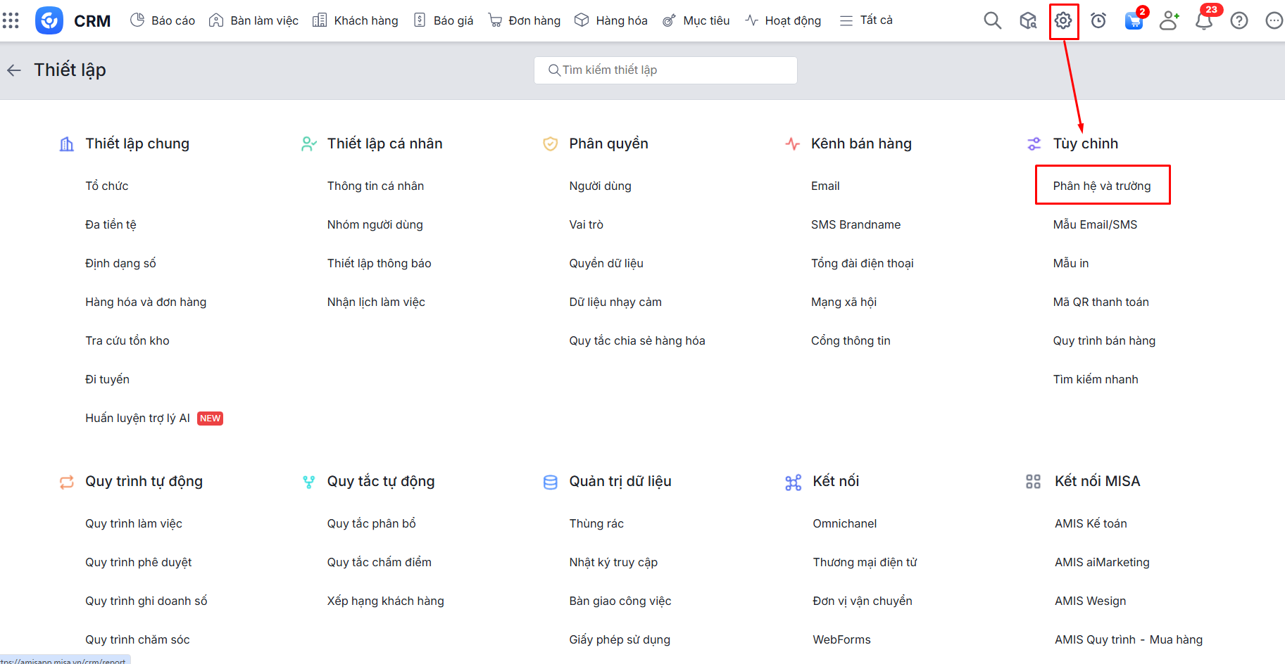 để vào Thiết lập\ Vào Tùy chỉnh\ Phân hệ và trường.