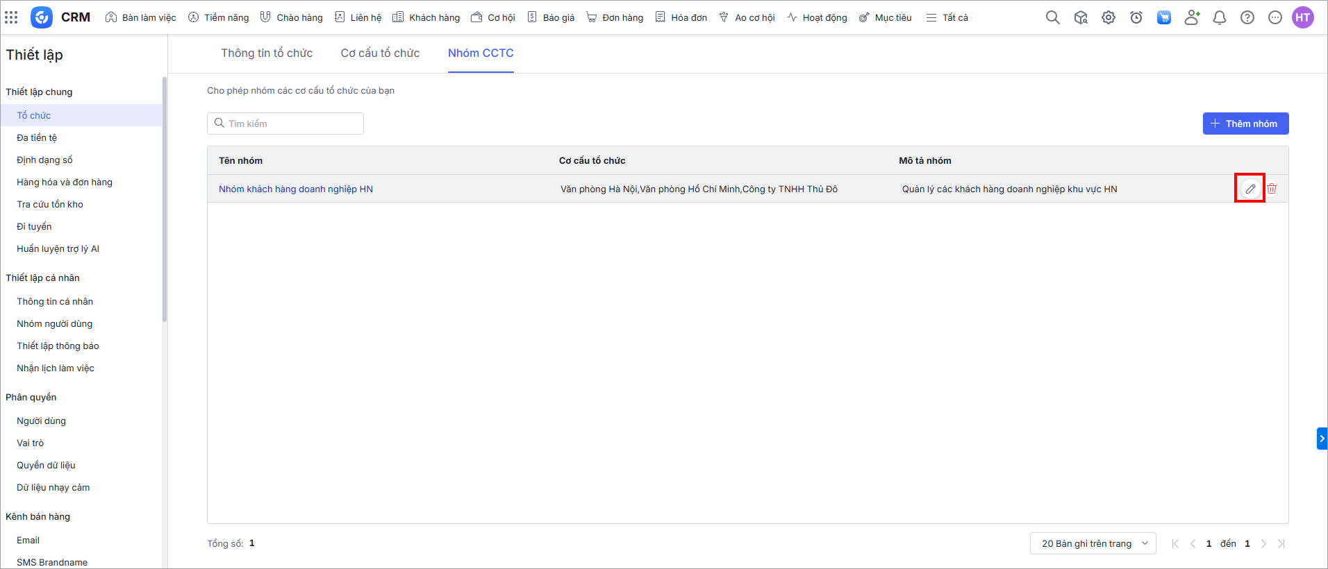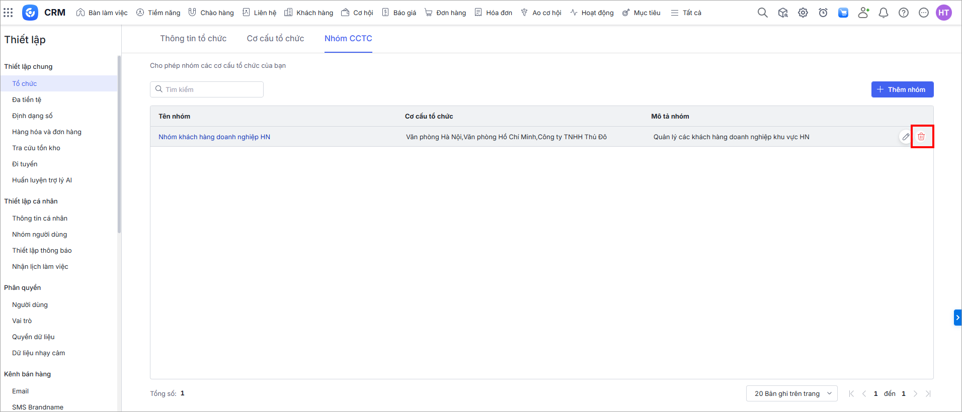 Bước 1: Ở danh sách Nhóm CCTC, di chuột vào dòng nhóm CCTC muốn sửa và nhấn biểu tượng thùng rác